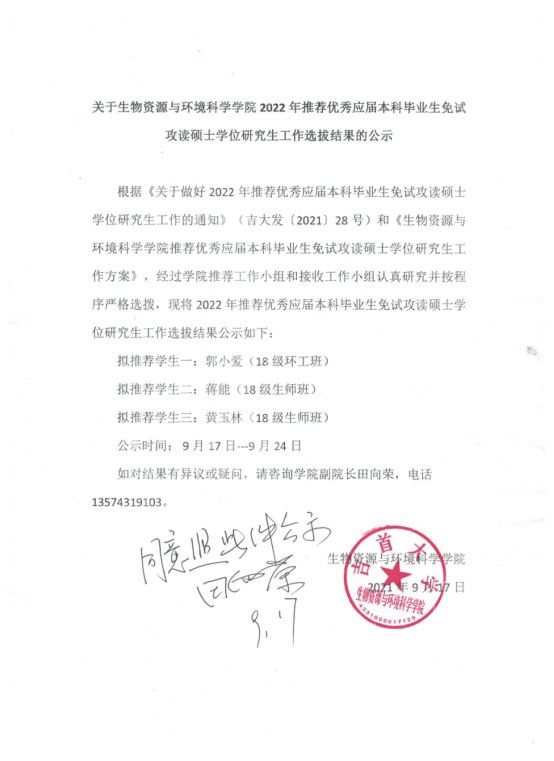 关于生物资源与环境科学公司2022年推荐优秀应届本科毕业生免试攻读硕士学位研究生工作选拔结果的公示