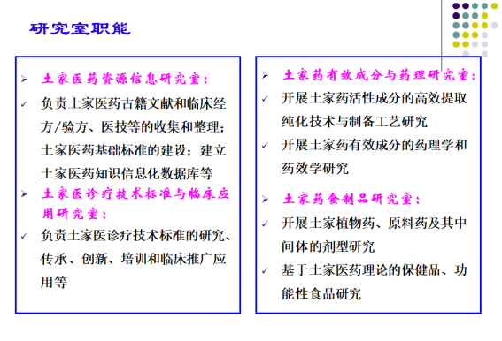 目前,重点实验室正开展传统土家医药古籍文献和临床经验、秘验方、医技的收集和整理,建立土家医药知识信息化数据库;开展特色土家医诊疗技术标准(土家医麝针疗法、土家医推油火疗法、土家医烧艾疗法、土家医放痧疗法、土家医扯罐疗法等)的制修订、培训和临床推广应用;开展土家药用植物白头婆、白花泡桐、青钱柳、显齿蛇葡萄和杜仲等活性化合物的分离、制备及药理药效研究;开展抗疲劳和醒酒护肝、治疗骨质疏松和关节炎等功能性食品/保健品研发以及抗艾滋病、肾衰竭、痛风等土家药的研发等。