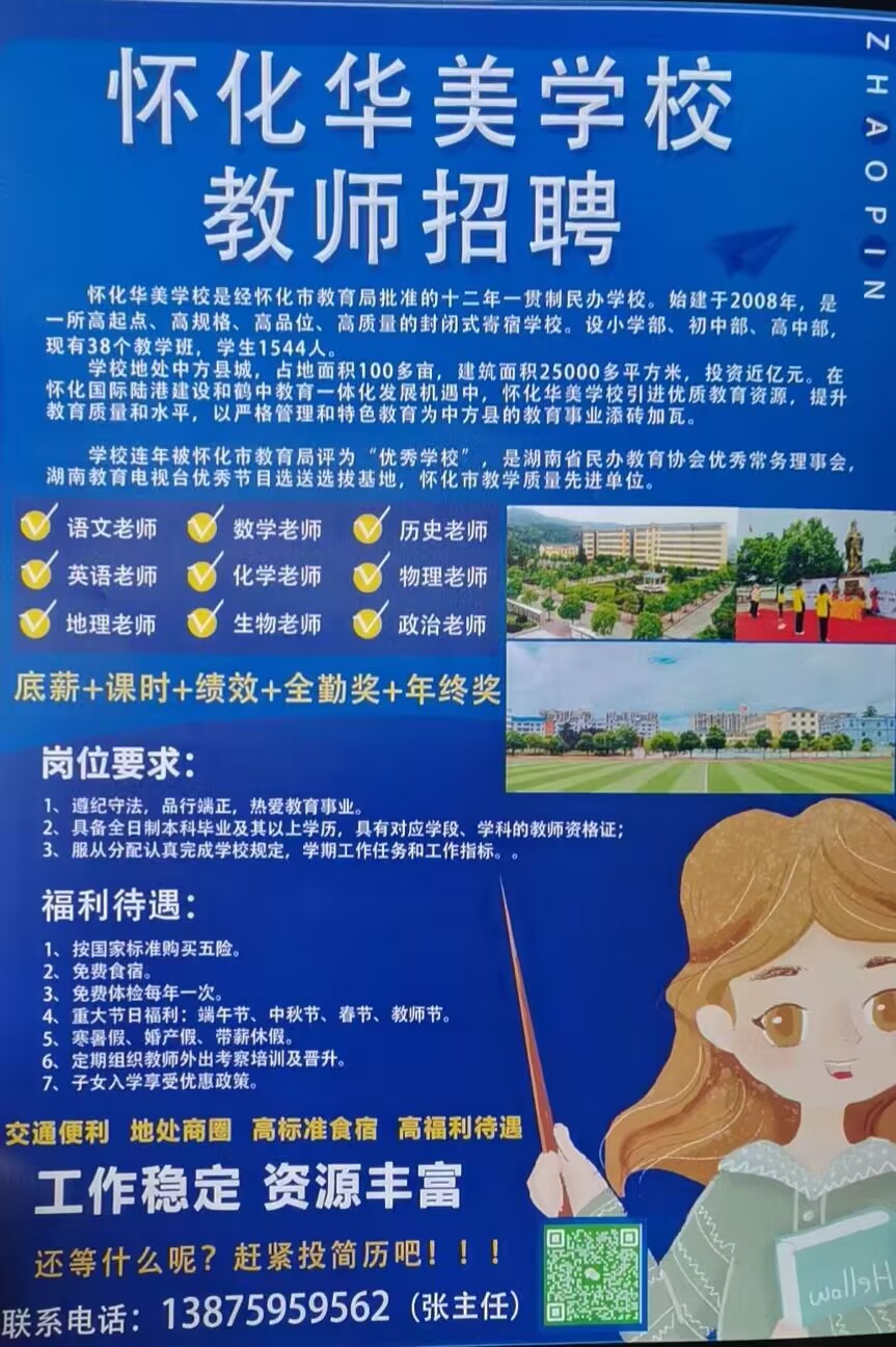 怀化华美公司教师本次招聘的是初中、高中各学科老师。