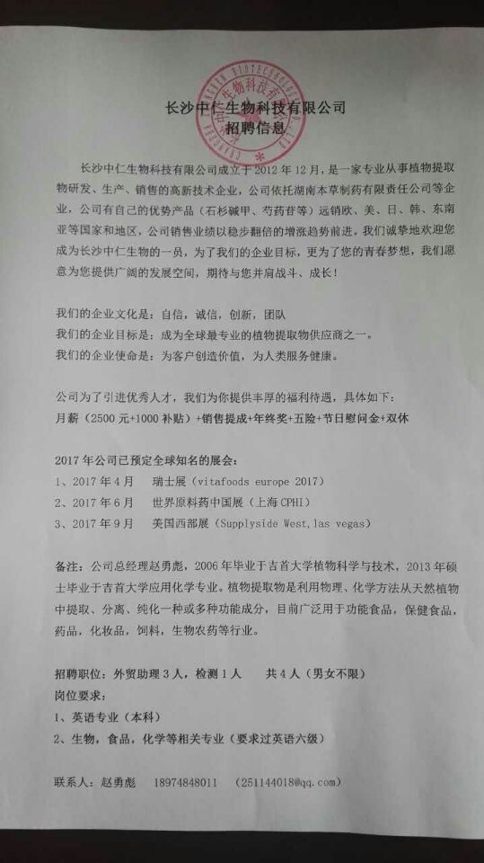 长沙中仁生物科技有限公司招聘