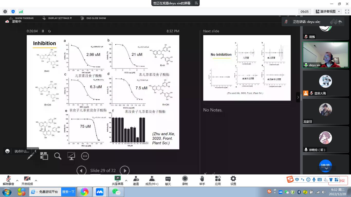 此次学术报告旨在介绍饮用绿茶有助于对抗新冠病毒。谢德玉教授团队采用分子模拟软件AutoDock Vina 预测了能与SARS-CoV-2 主蛋白酶结合并抑制其活性的类黄酮化合物,并通过实验确定了表没食子儿茶素没食子酸酯(epigallocatechin-gallate, EGCG)、表儿茶素没食子酸酯(epicatechin-gallate)和其他的黄烷-3-醇没食子酸酯(flavan-3-olgallates, F3Gs)、二聚原花青素(dimeric PAs)以及富含这些化合物的绿茶提取物不仅可以抑制 SARS-CoV-2 主蛋白酶的活性,还可以抑制冠状病毒 229E在人体细胞中的复制。然后,谢德玉教授团队采用流行病学调查, 人口统计学,民族药学等方法收集人们饮用绿茶对抗新冠的数据。数据表明,每天喝绿茶越多的新冠患者恢复的越快,人均茶叶消费量越高的国家,新冠患者死亡率越低。基于这些研究和发现,谢德玉教授建议:每天饮用3克以上不加任何奶制品的绿茶就能够得到足量的抑制新冠的黄酮化合物。谢德玉教授还指出,如果茶里有涩味和苦味,就表明喝到了以上那些黄酮化合物。味道越涩,黄酮化合物含量越多。最后,谢德玉教授期望听众向社会传播该疫情防控建议,帮助更多的人战胜新冠。