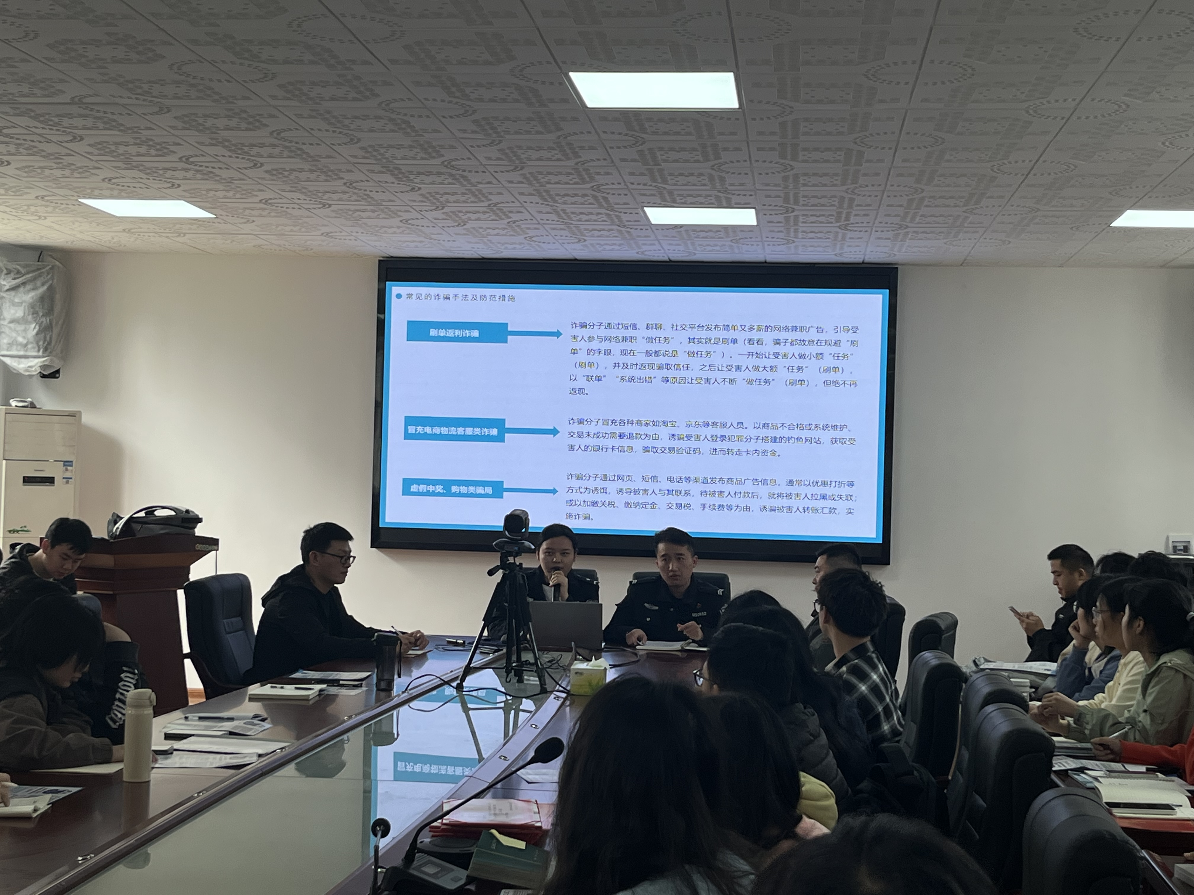 会上,符梦笛结合现场发放的宣传资料,向同学们详细介绍了常见电信诈骗的种类、特点以及防范电信诈骗的方法,提醒同学们要远离电信网络诈骗犯罪,切勿贪小便宜,以免因小失大,痛失个人财产,并告诫同学面对不认识的电话号码时一定要提高警惕,切记不能向对方透露自己及家人的身份、存款、银行卡等信息。