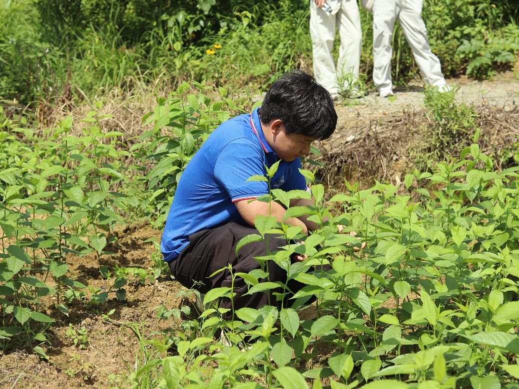 (图为小分队队成员张超同学在观察当地种植的杜仲苗)