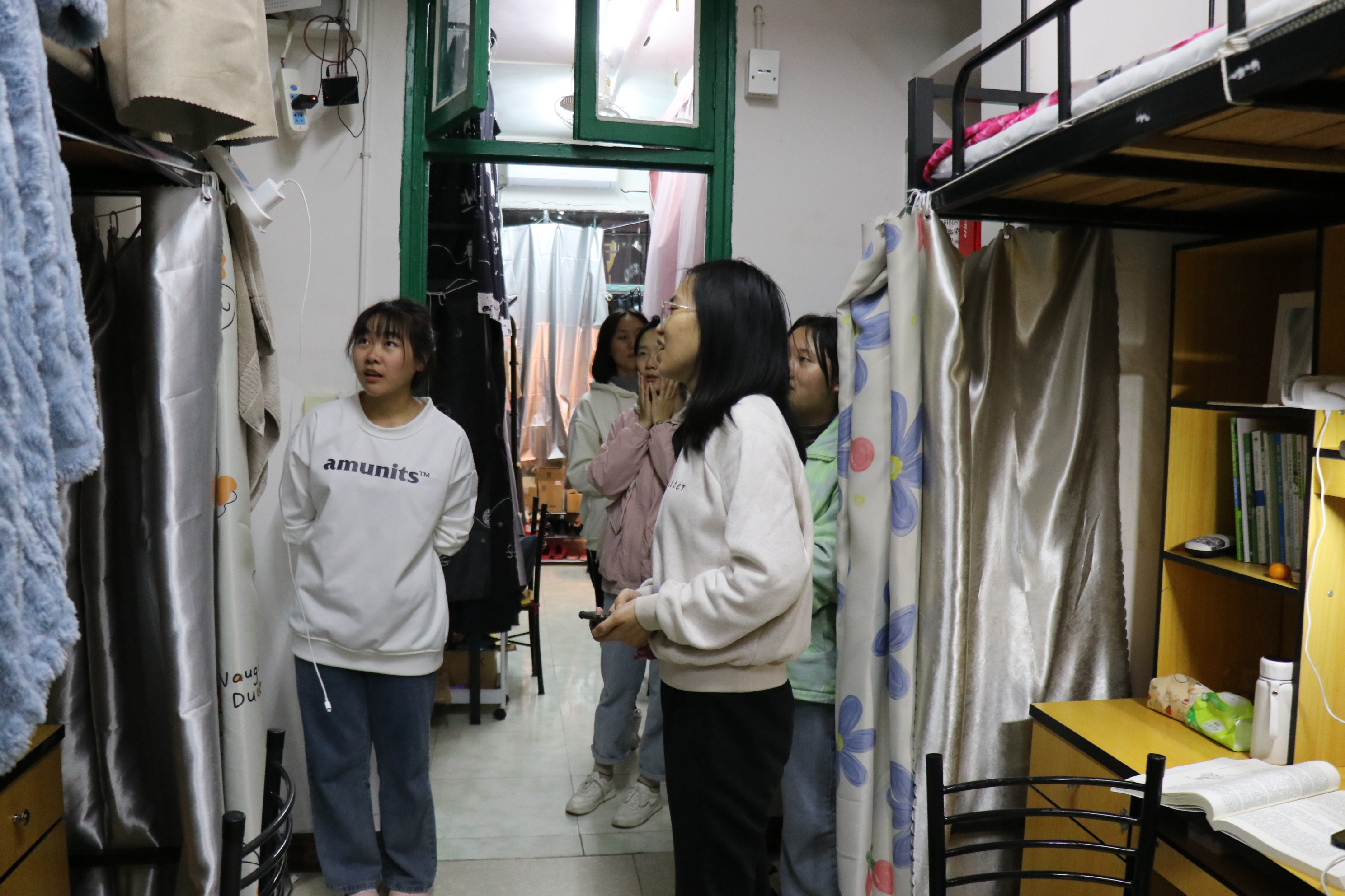 (图为老师下寝查看宿舍情况)