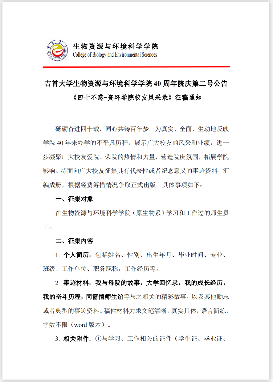 吉首老员工物资源与环境科学公司40周年院庆公告(第二号)