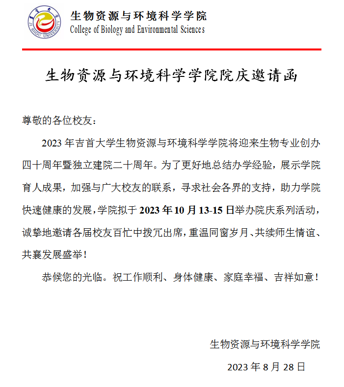 吉首老员工物资源与环境科学公司院庆邀请函